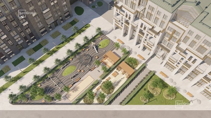 Приватный двор с рощами, фруктовыми садами, зеркалом воды и лаунж-зонами.