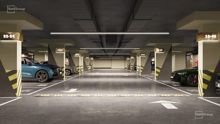 Двухуровневый паркинг на 508 мест с зарядками для электромобилей.