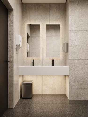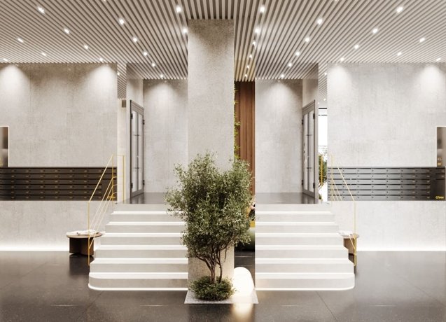 Лобби 155 м² с дизайнерской отделкой, колясочными и местами для хранения.