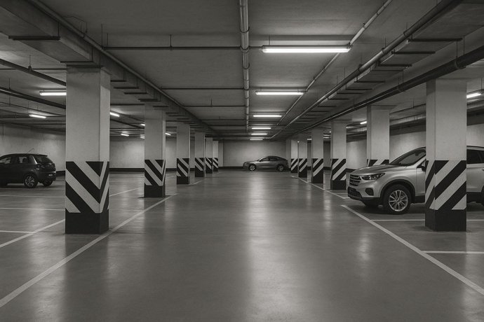 Отапливаемый паркинг на 63 места и 57 кладовых помещений.