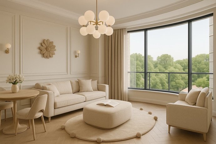 Потолки 3 м, панорамные окна и французские балконы для большего света.
