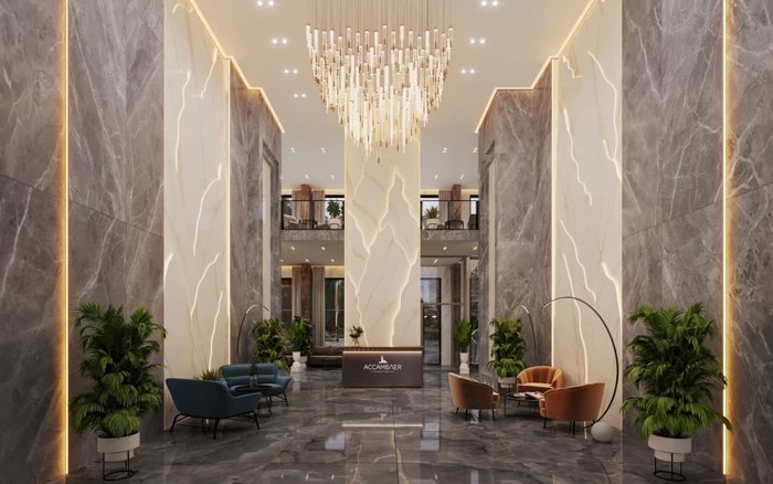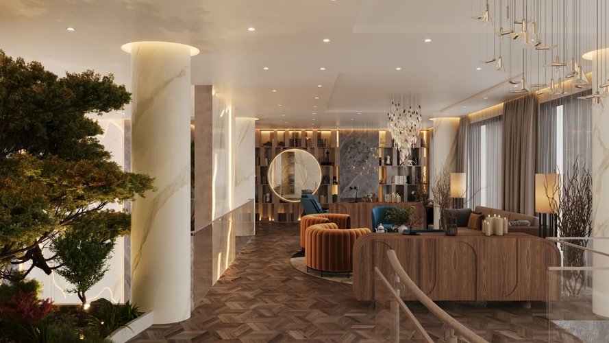 Парадное лобби 220 м² с потолками 7,7 м, ресепшеном и зонами ожидания.