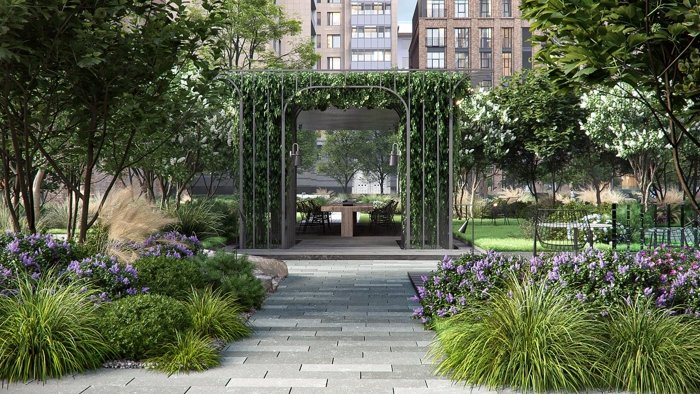 Двор по принципу «лесных комнат»: зелёные зоны, перголы и прогулочные пространства.