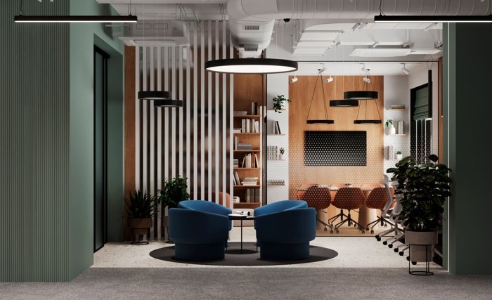 Клуб 155 м²: коворкинг, фитнес-зал, кинозал, библиотека и клубная гостиная.