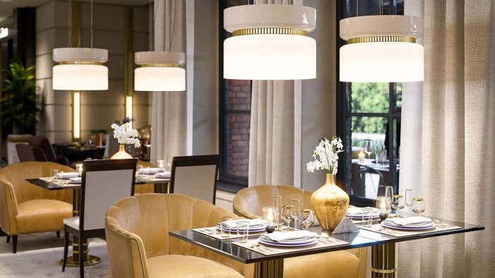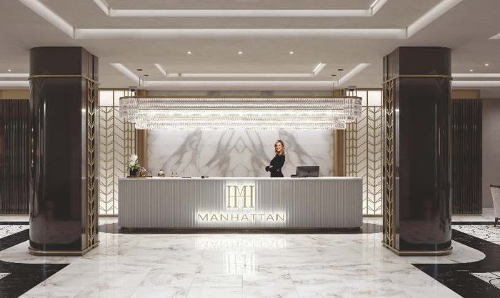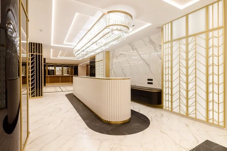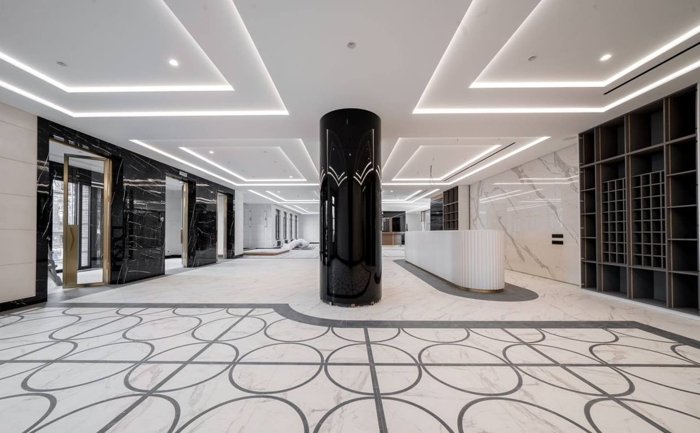 Парадное лобби с итальянским мрамором, деревом и просторными лаунж-зонами.