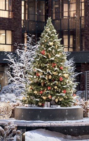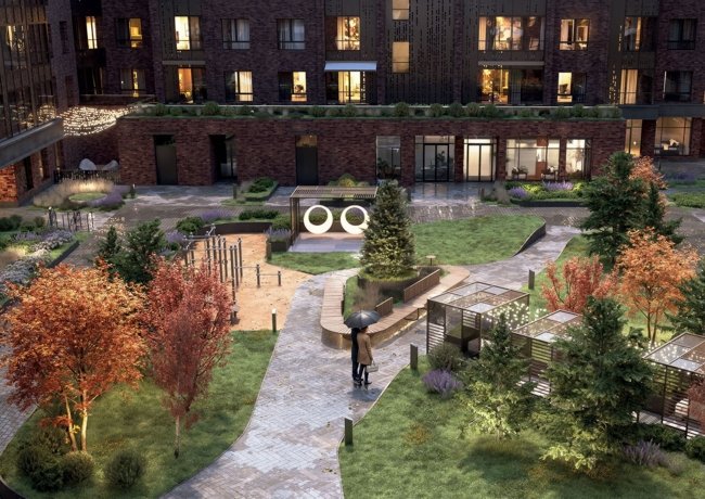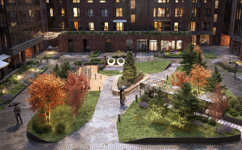 Подсветка растений и дорожек. Центральная площадь для сезонных событий и новогодней ели.