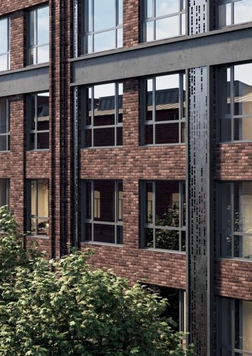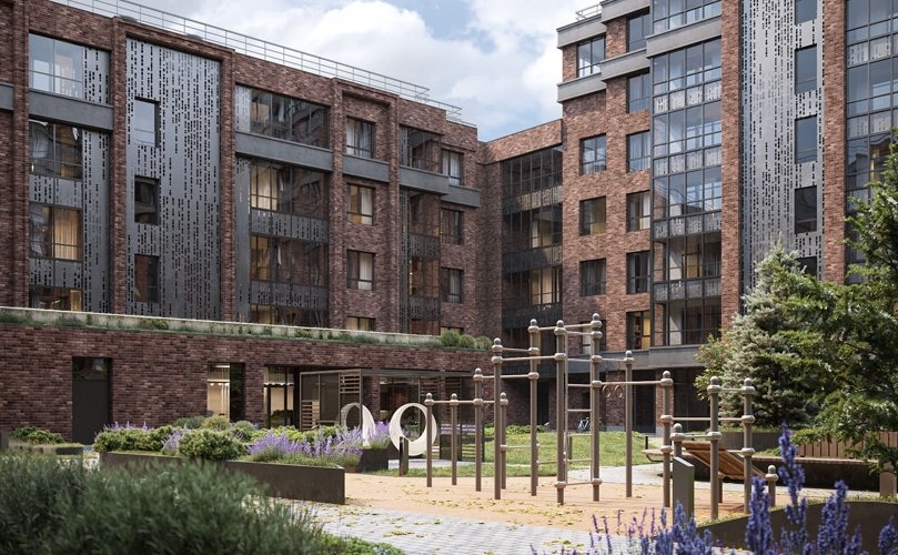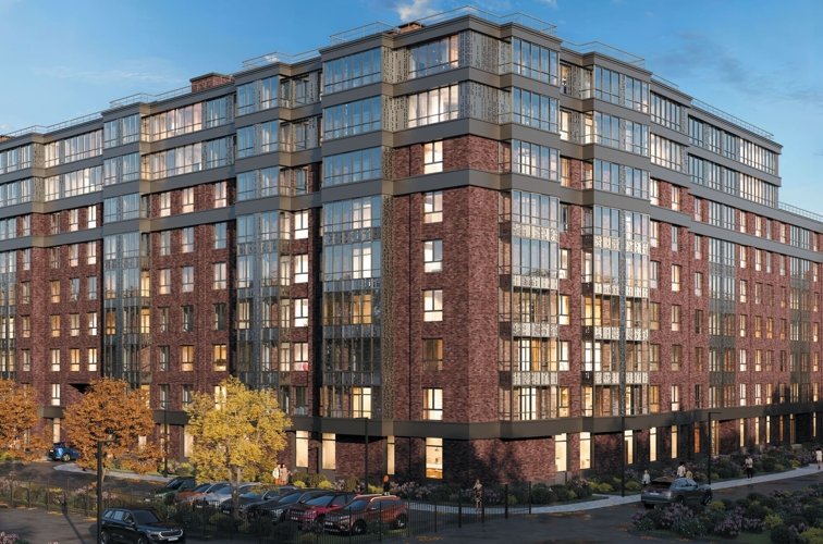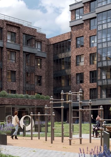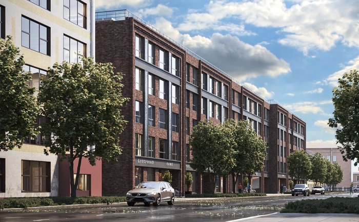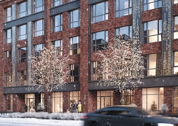 Дом переменной этажности 5–9 этажей с индустриальной кирпичной архитектурой. 360 квартир с потолками 2,84–3,34 м, увеличенными окнами и возможностью гибкой перепланировки. Предусмотрены террасы, подземный паркинг на 116 мест и коммерция на первом этаже.