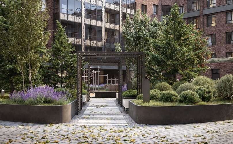Приватный двор без машин с озеленением, декоративными деревьями и зонами отдыха.