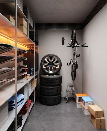 Паркинг на 99 мест с лифтом на этажи и индивидуальными кладовыми.