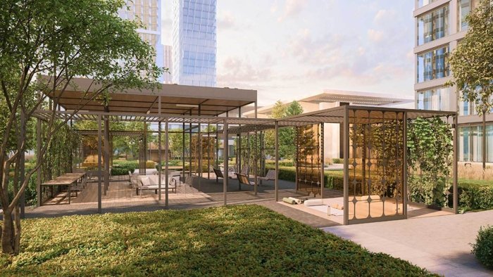 Двор на стилобате с зонами отдыха, прогулочным променадом и пространствами для работы.